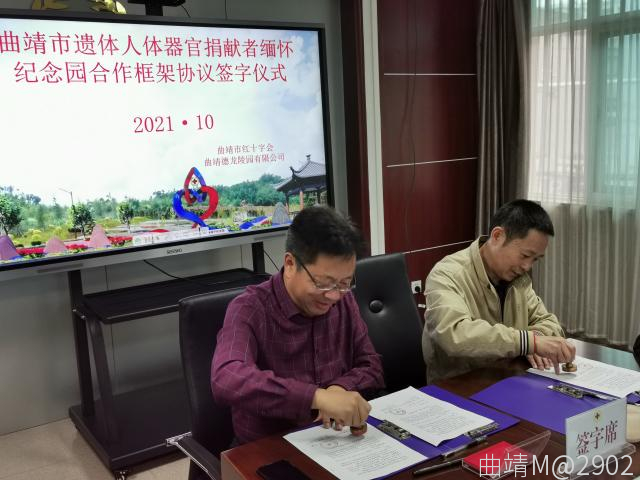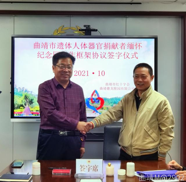 10月13日,曲靖市紅十字會舉行曲靖市遺體人體器官捐獻者緬懷紀念園項目建設簽約儀式,曲靖市紅十字會與曲靖德龍陵園有限公司正式簽訂了項目建設協議書。該紀念園的建成是我市首個,云南省第五個遺體人體器官捐獻者紀念園。市紅十字會干部職工、志愿者代表,曲靖德龍陵園有限公司董事長,總經理參加簽約儀式。