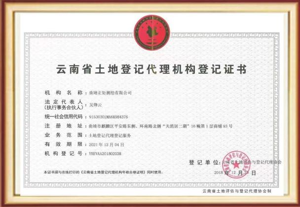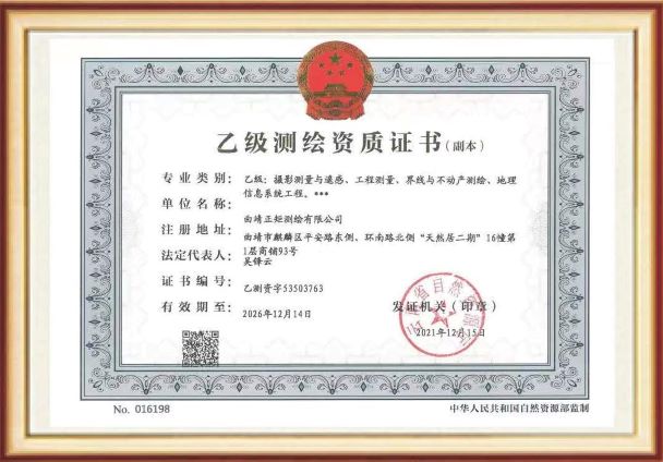• 曲靖正矩測繪有限公司于2016年12月19日成立,注冊資金50萬元,擁有:乙級測繪資質、云南省土地登記代理機構登記證書、通用航空企業(yè)經營許可證。